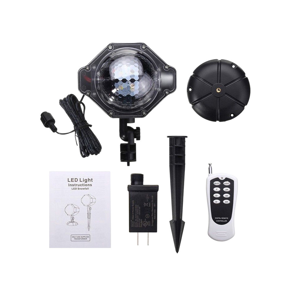 Led snowfall light*1 round base*1 ground stake*1 remote control*1 power adapter*1 instruction manual *1lifelike snowfall 2019 new version mini snowfall projector light has can create immediate lifelike snowfall atmosphere, will add more romantic and wonderful.